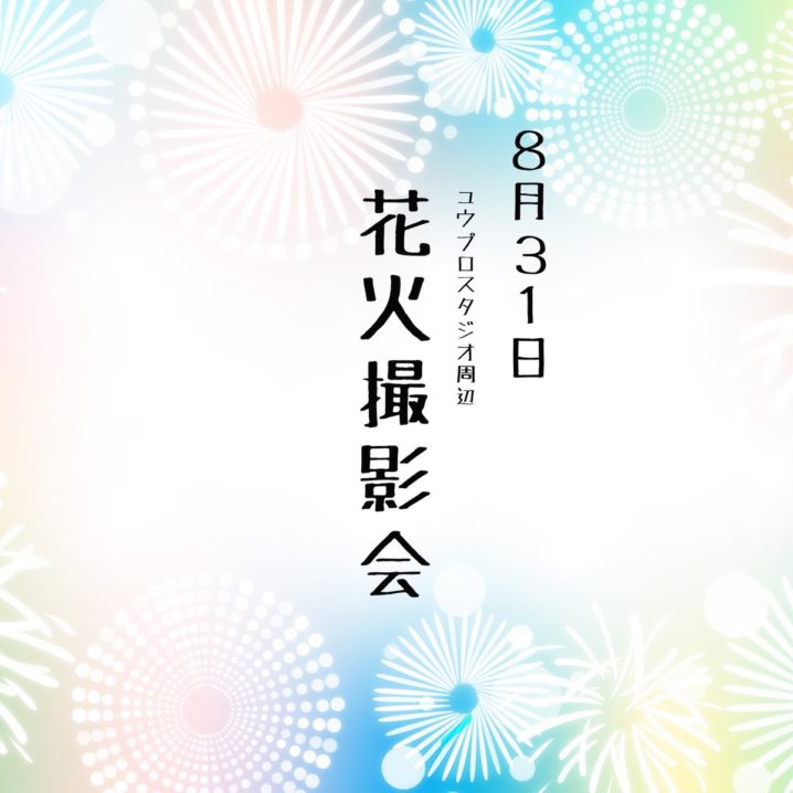 8/31(日)『花火撮影会&みるきど紅葉合同花火オフ会』※手持ち花火を用意致します!! 会場:ユウプロスタジオ周辺公園 撮影会▼時間:13:00-16:50料金:1枠20分3500円受付期間:8/9 22:00~8/30…