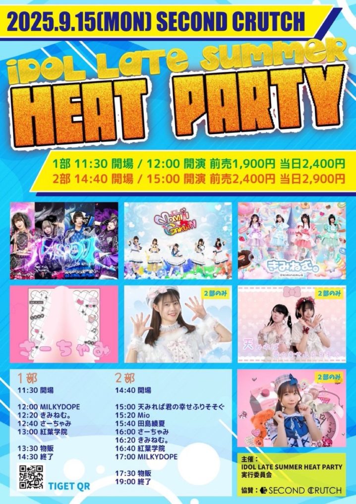 9/15(月祝)『IDOL LATE SUMMER HEAT PARTY』 会場:セカンドクラッチ1部▼時間:OP11:30/ST12:00料金:前売1900円/当日2400円+1D2部▼時間:OP14:40/ST15:…