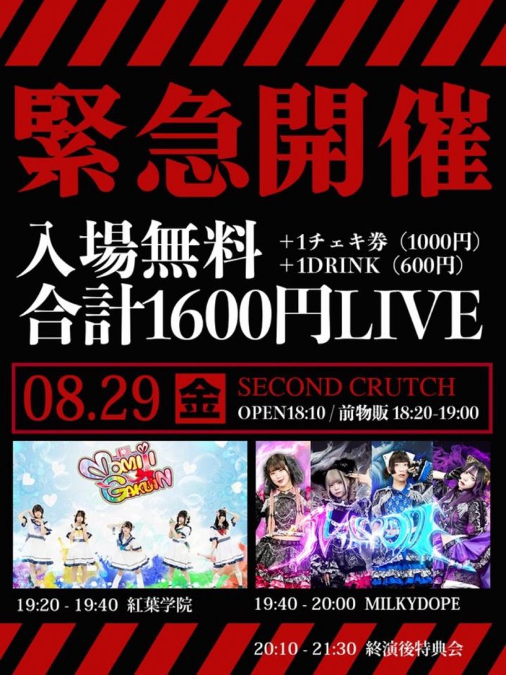 8/29(金)『緊急開催 入場無料+1D600円+1チェキ券1000円 合計1600円LIVE』 会場:セカンドクラッチ時間:前物販18:10/ST19:20料金:入場無料+1D600円+1チェキ券1000円 予約開始 …