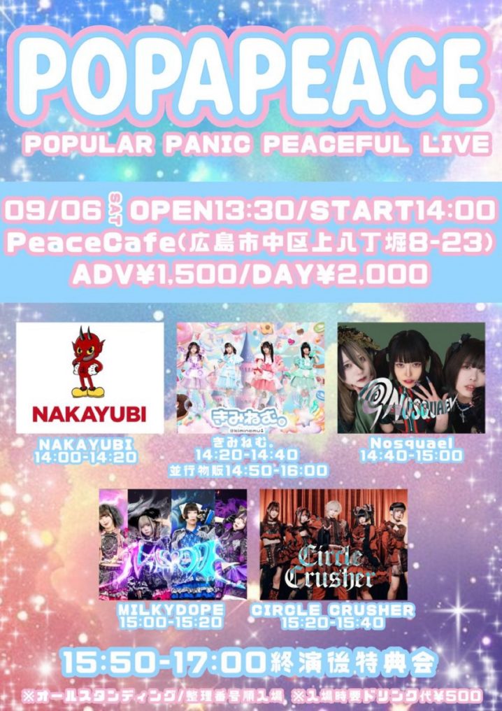 9/6(土)『POPAPEACE』 会場:ピースカフェ時間:OP13:30/ST14:00料金:前売1500円/当日2000円+1D 予約開始 8/25 19:00tiget.net/events/424467