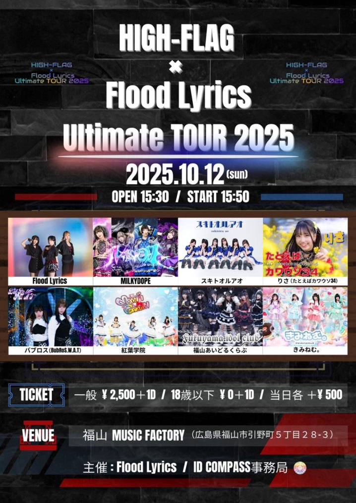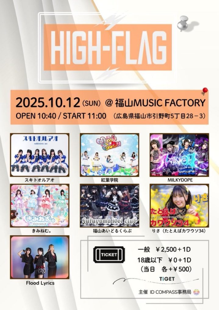 10/12(日)『HIGH-FLAG』 会場:福山MUSIC FACTORY(広島県福山市引野町5丁目28−3)時間:OP10:40/ST11:00料金:前売2500円/当日3000円+1D※18歳以下0円+1D 予約開…