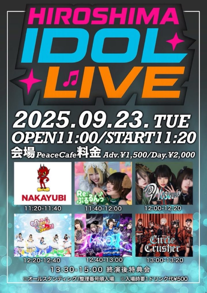 9/23(火祝)『広島アイドルライブ』 会場:ピースカフェ時間:OP11:00/ST11:20料金:前売1500円/当日2000円+1D 予約開始 9/16 20:00tiget.net/events/429805
