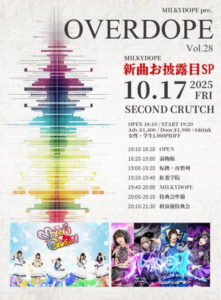 10/17(金)『OVERDOPE vol.28 MIKLYDOPE新曲お披露目SP』 会場:セカンドクラッチ時間:OP18:10/前物販18:20/LIVE ST19:20料金:前売1400円/当日1900円+1D※女…