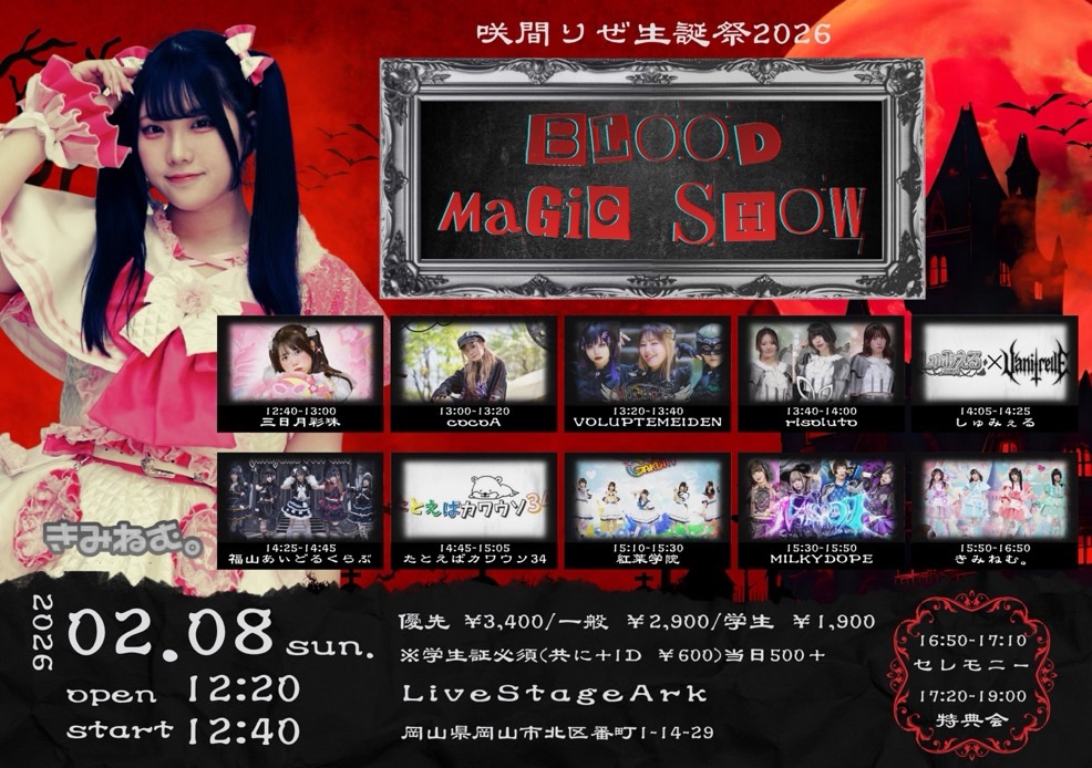 2025.12.11 LIVE情報 info@you-project.jp 【2/8】『咲間りぜ生誕祭2026〜BLOODMAGICSHOW〜』 岡山 2/8(日)『咲間りぜ生誕祭2026〜BLOODMAGICSHOW〜』 会場:LiveStageArK時間:OP12:20/ST12:40料金:前売2900円/当日3400円+1D※学生1900円 予約▽tiget.net/events/448448