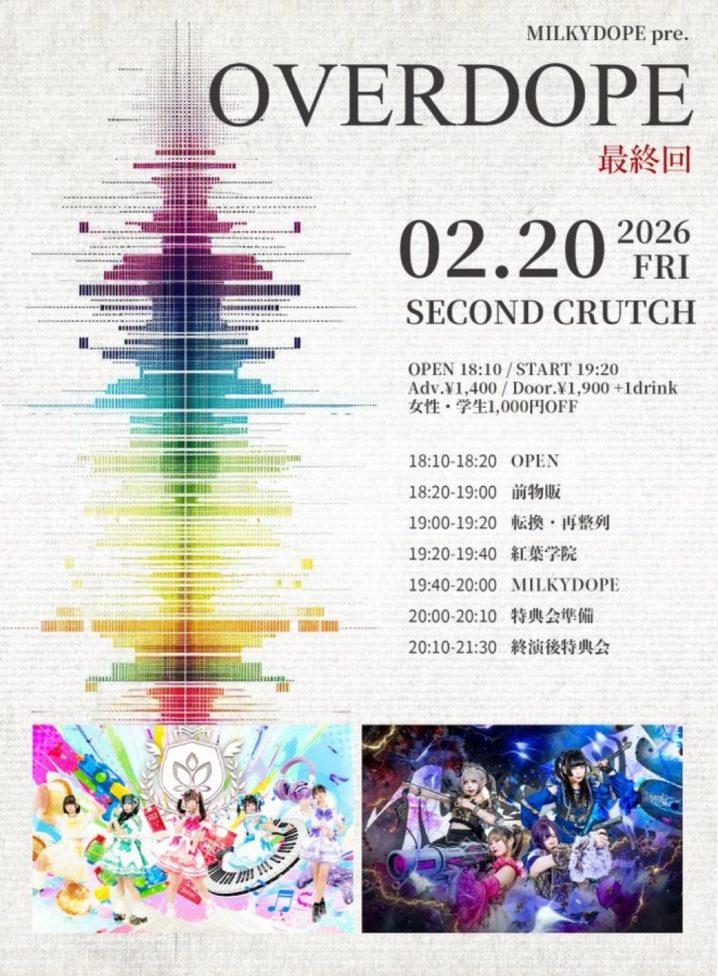 2/20(金)『OVERDOPE~最終回~』 会場:セカンドクラッチ時間:OP18:10/前物販18:20-19:00/ST19:20料金:前売1400円/当日1900円+1D 予約開始 1/30 22:00~tiget…