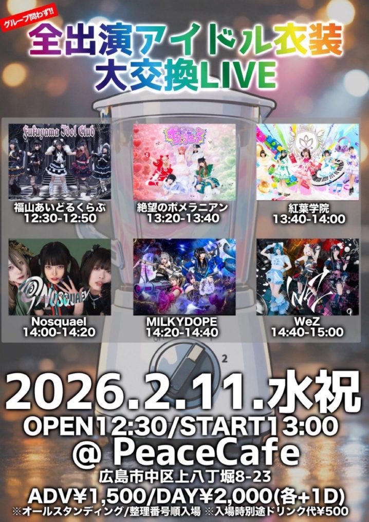 2/11(水)『全出演アイドル衣装大交換LIVE』 会場:ピースカフェ時間:OP12:30/ST13:00料金:前売2,000円/当日2,500円 予約 2/4(水)21:00〜tiget.net/events/4642…