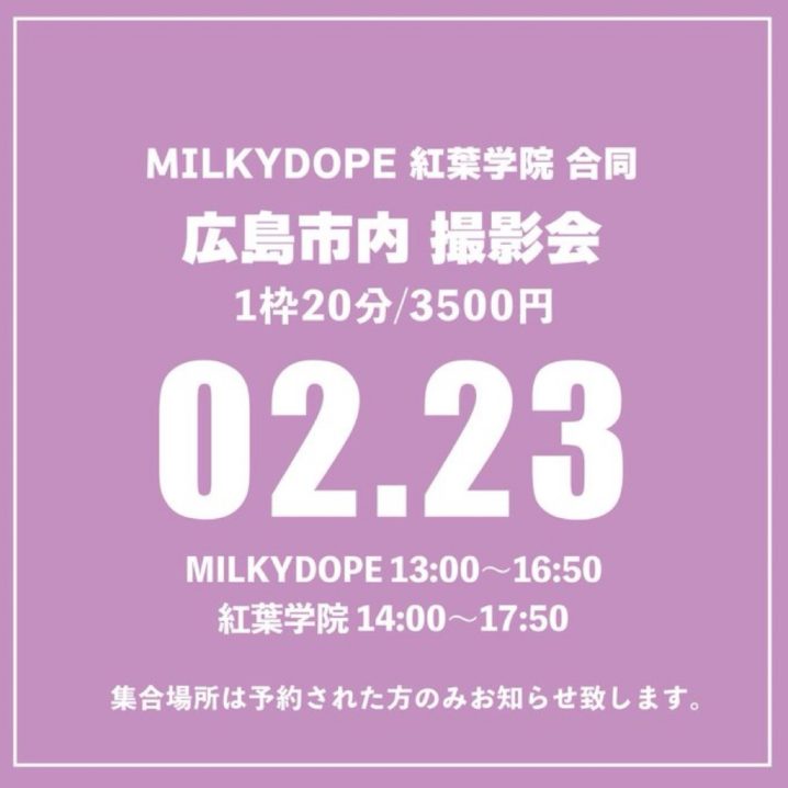 2/23(月)『広島市内 撮影会』 会場:広島市内※ご予約者のみ集合場所をお知らせします。時間:13:00-16:50料金:1枠20分/3500円 受付開始 2/12 21:00〜 2/22 23:59milkydope…