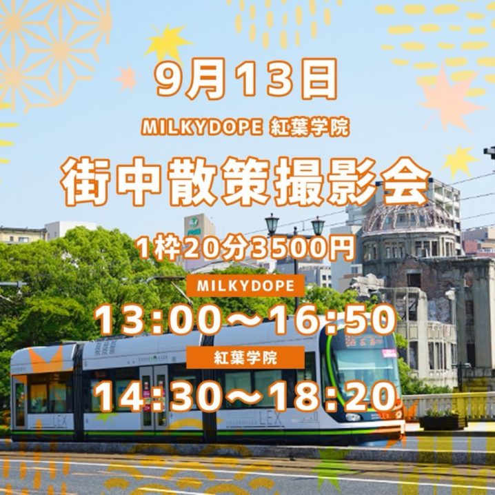 5/11(日) MILKYDOPE×紅葉学院 『合同撮影会』 場所:広島駅北口 時間:14:00-16:50 料金:1枠20分3500円 受付期間 5/1 19:00~5/10 23:59 milkydope.offic…
